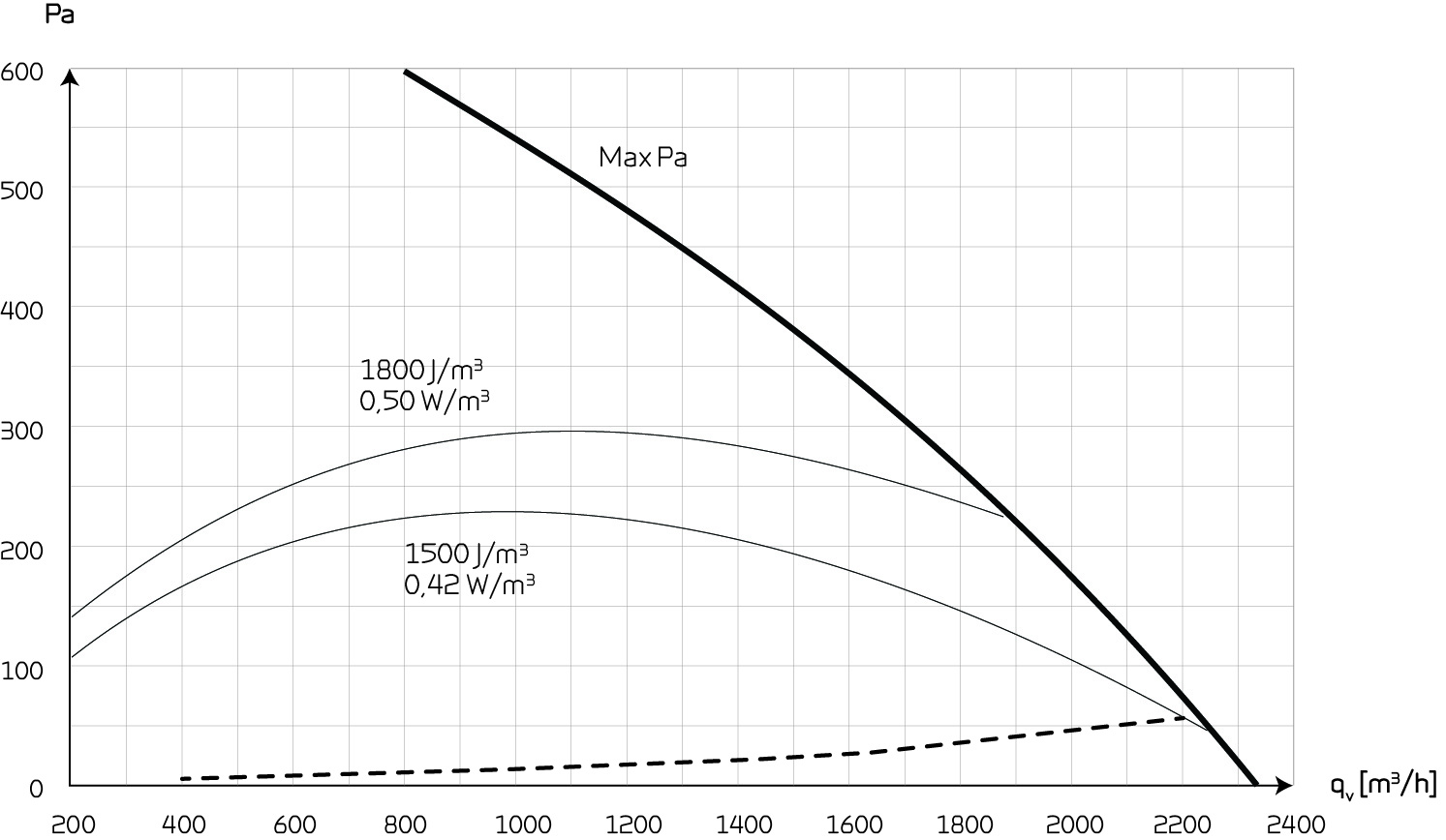 Capacity (condensation exchanger)The following design data is calculated on the basis of a condensation exchanger. Max Pa capacity of standard unit, Pt,ext as a function of qv, with regard to SFP-values. SFP-values according to EN13053 for a standard unit with ISO ePM10 >60% (M5) & ISO ePM1 50% (F7) filters an no heating element. Attention! The SFP values are measured and stated as a total value for both fans. |