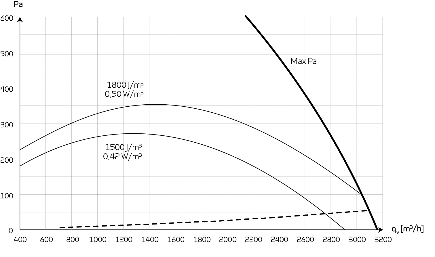 Max Pa capacity of standard unit, Pt,ext as a function of qv, with regard to SFP-values.